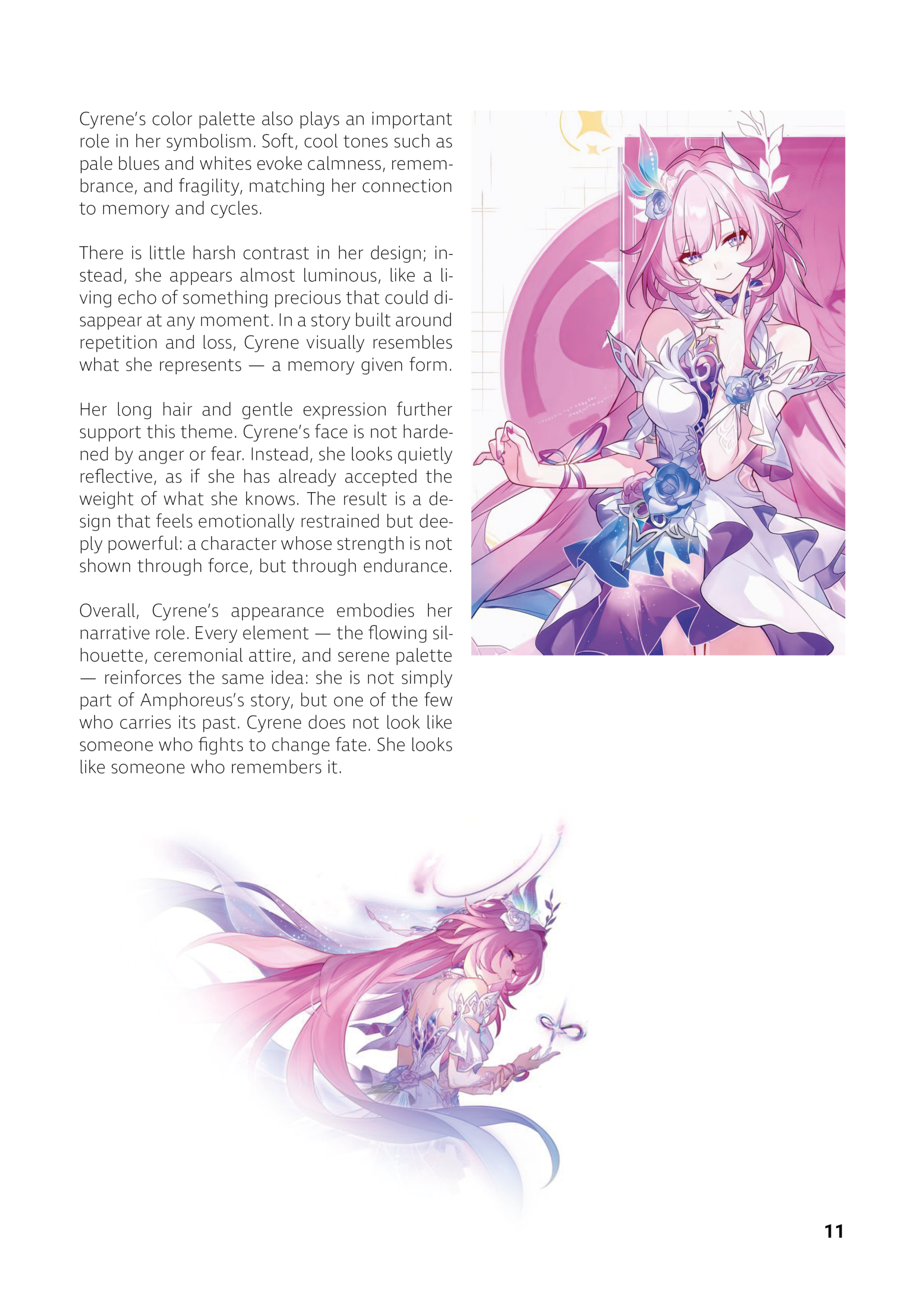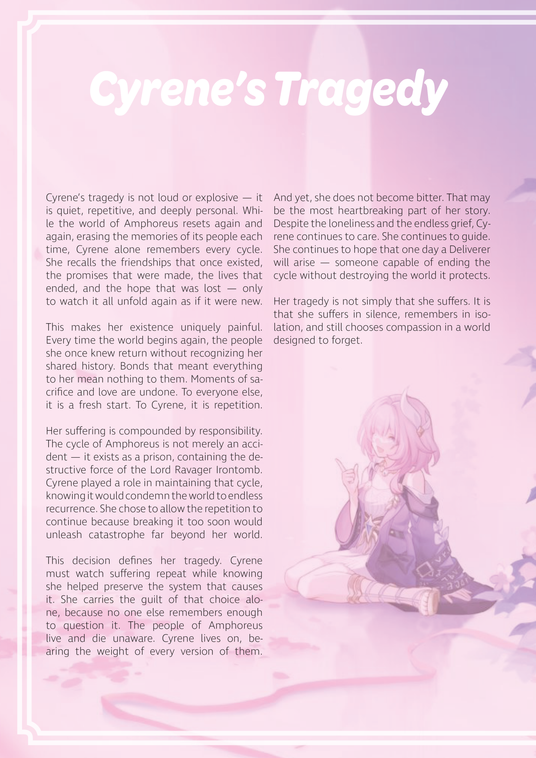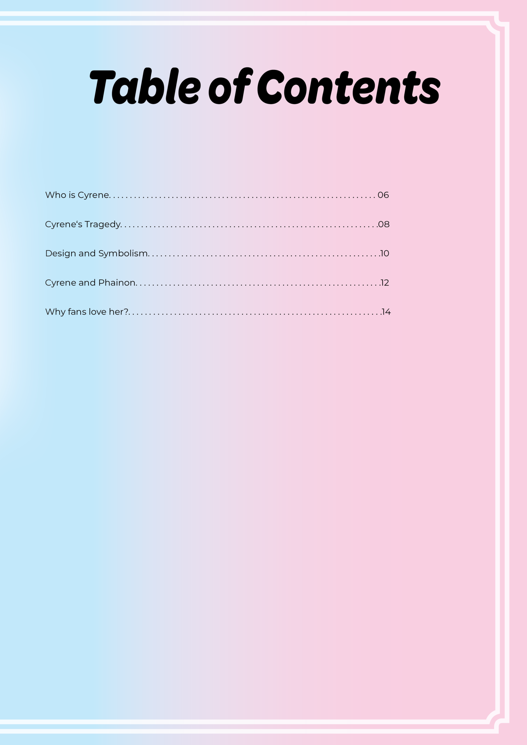 Der Hauptteil ist in mehrere Abschnitte unterteilt, zum Beispiel über Cyrenes Geschichte, ihre Tragödie, ihr Design und ihre Beziehung zu anderen Figuren. Die Reihenfolge ist so aufgebaut, dass man die Figur Schritt für Schritt besser versteht.