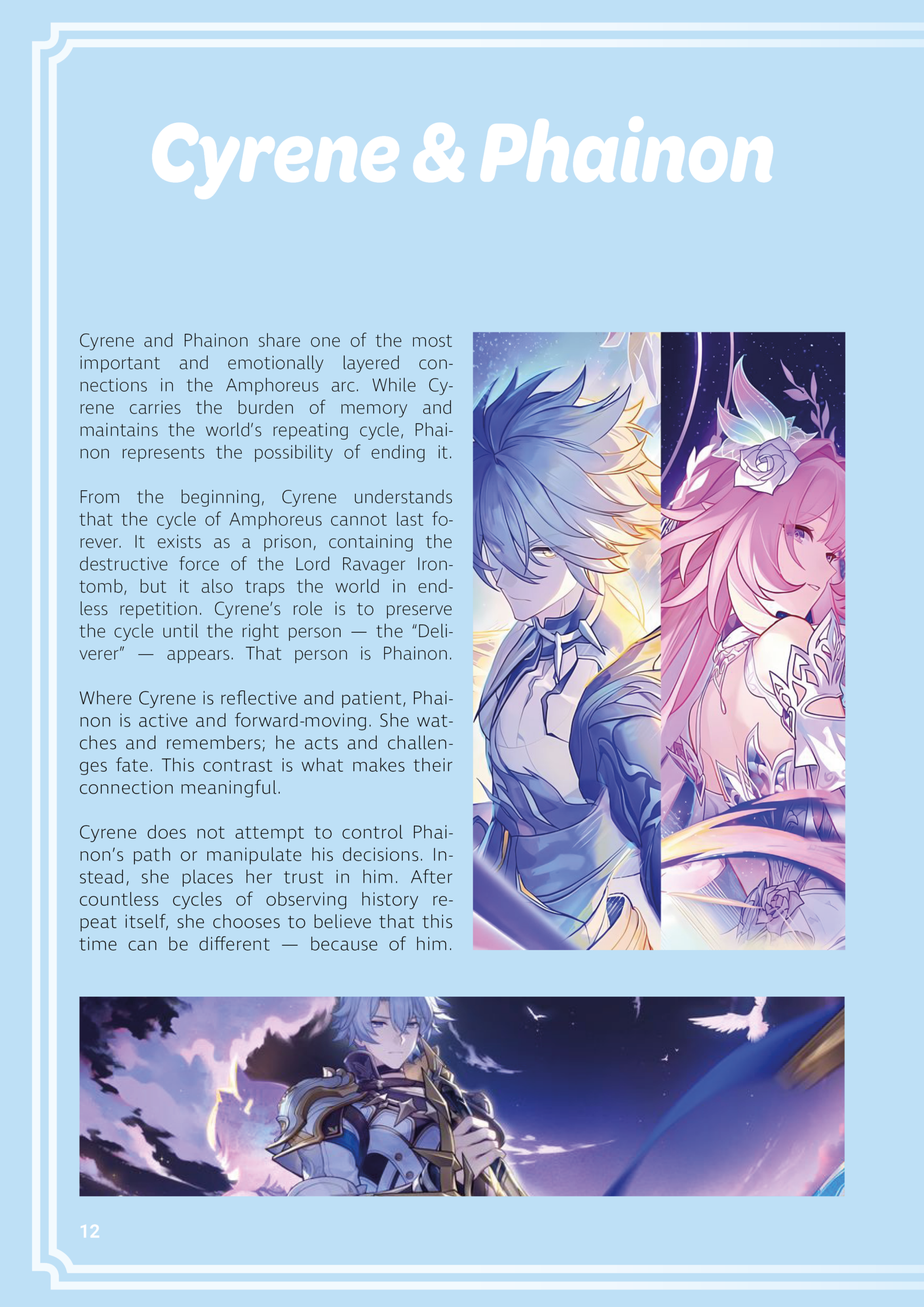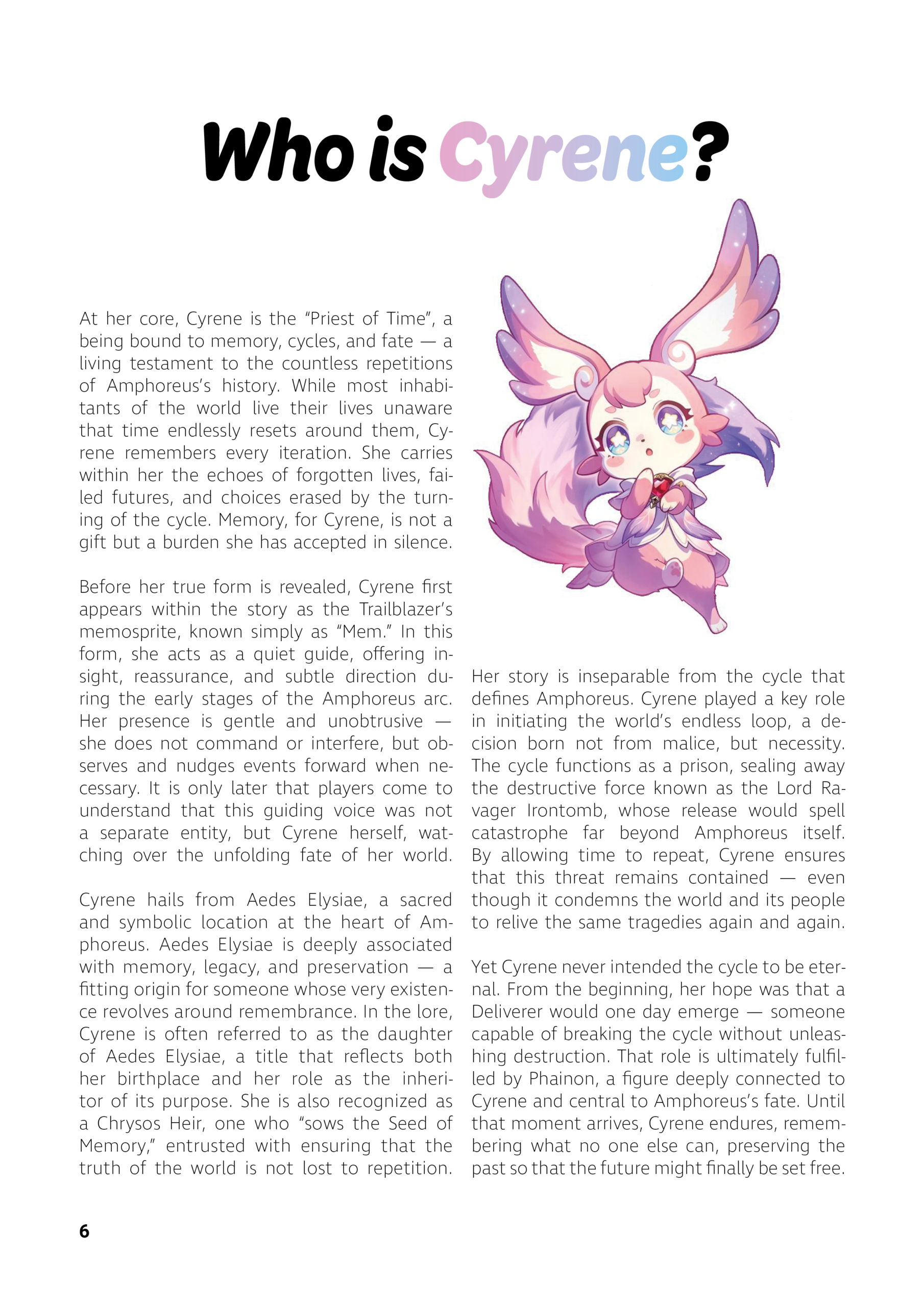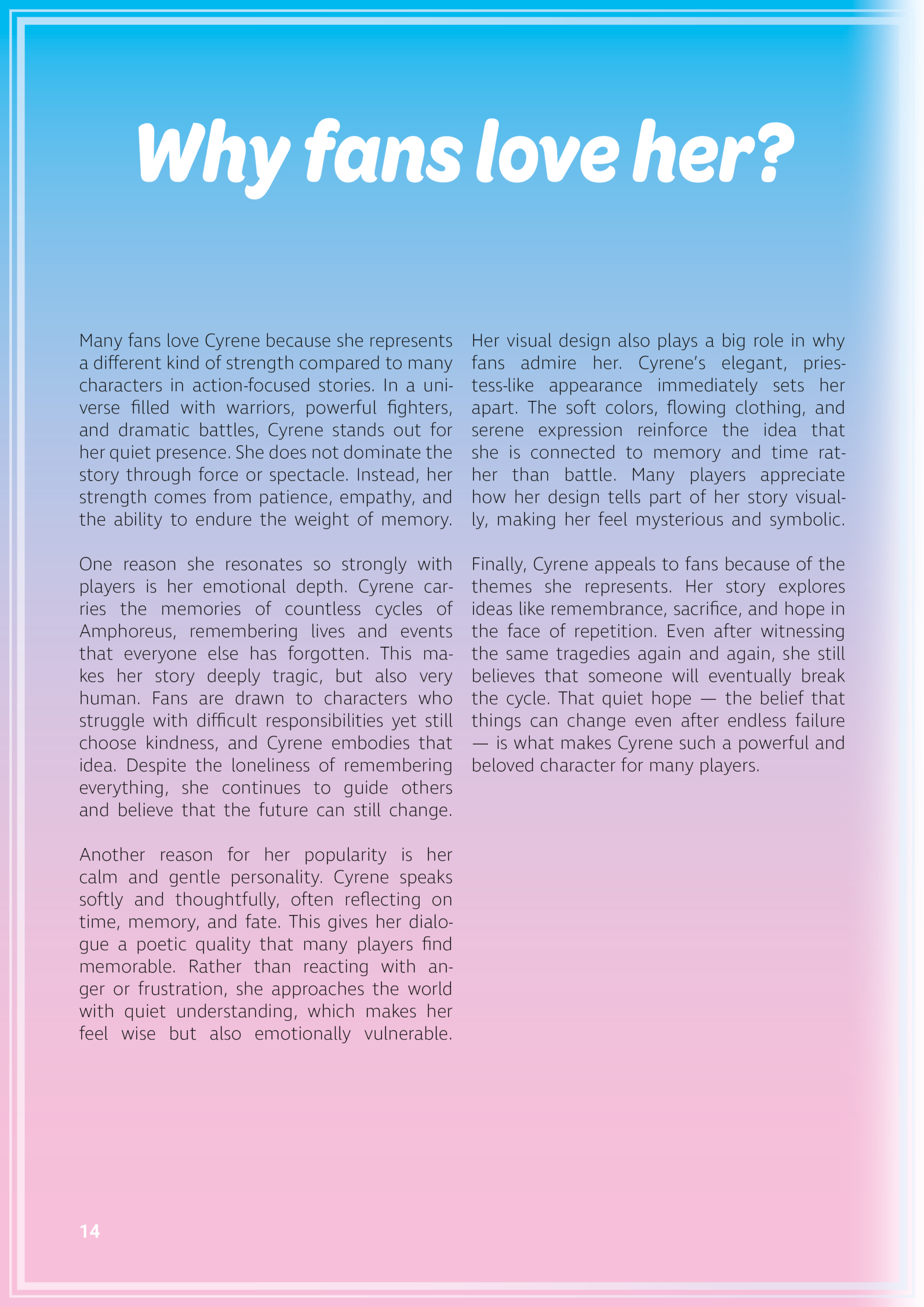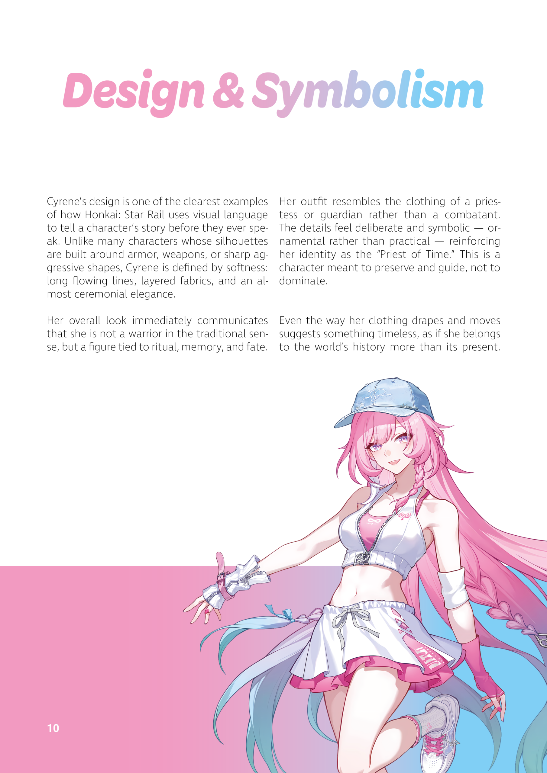 Der Hauptteil ist in mehrere Abschnitte unterteilt, zum Beispiel über Cyrenes Geschichte, ihre Tragödie, ihr Design und ihre Beziehung zu anderen Figuren. Die Reihenfolge ist so aufgebaut, dass man die Figur Schritt für Schritt besser versteht.